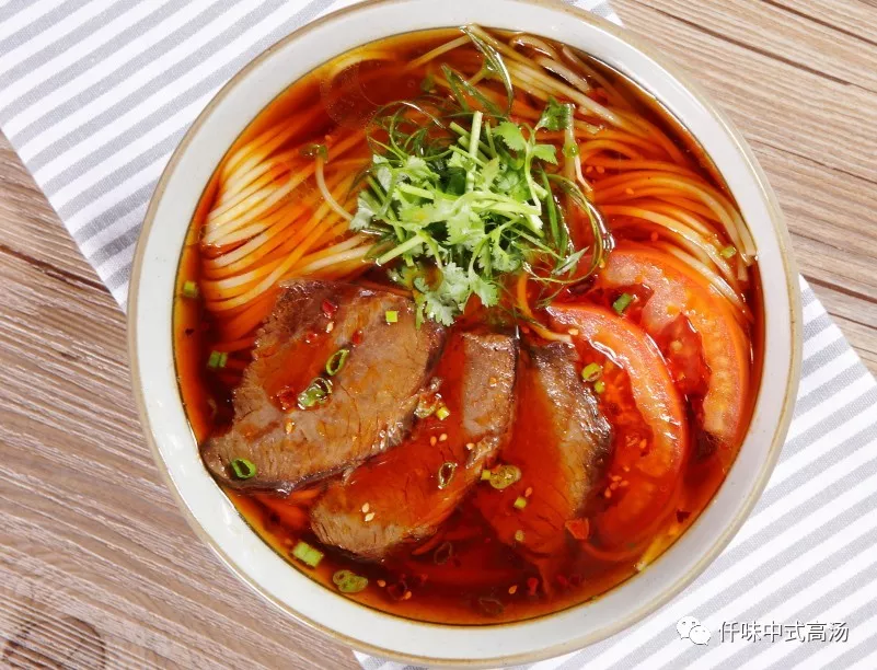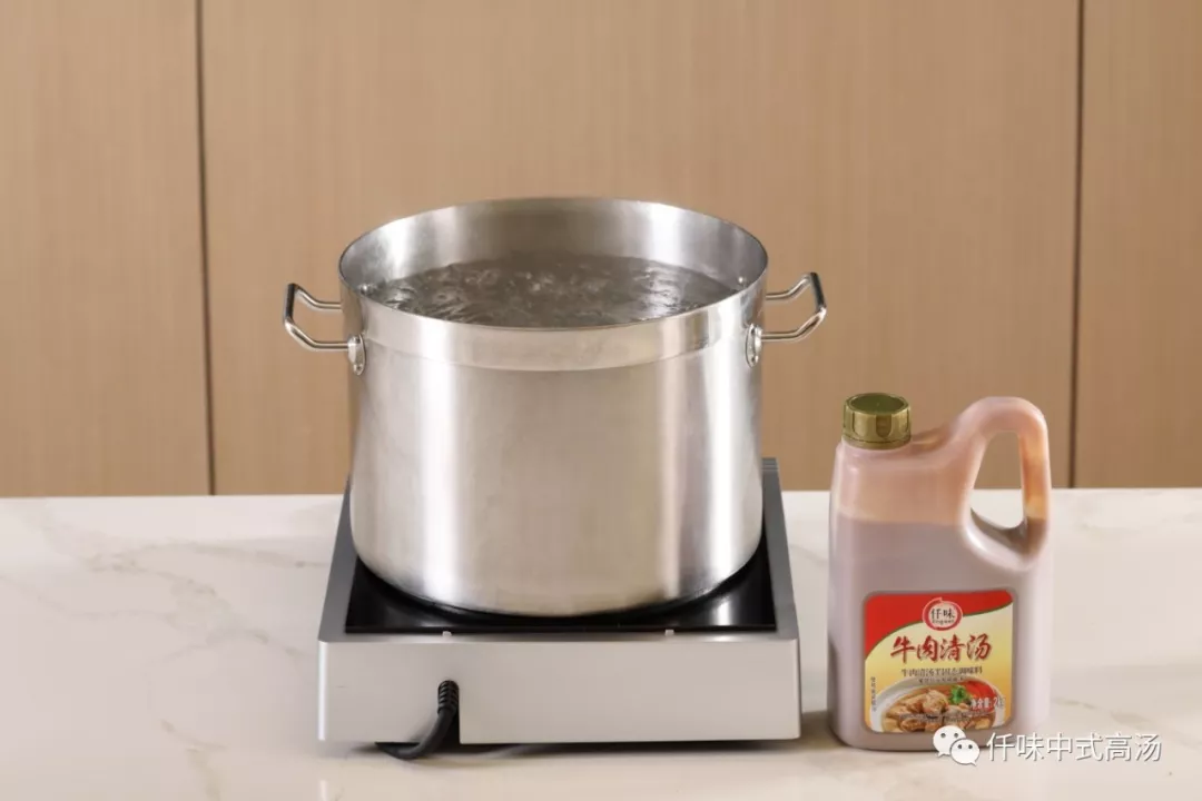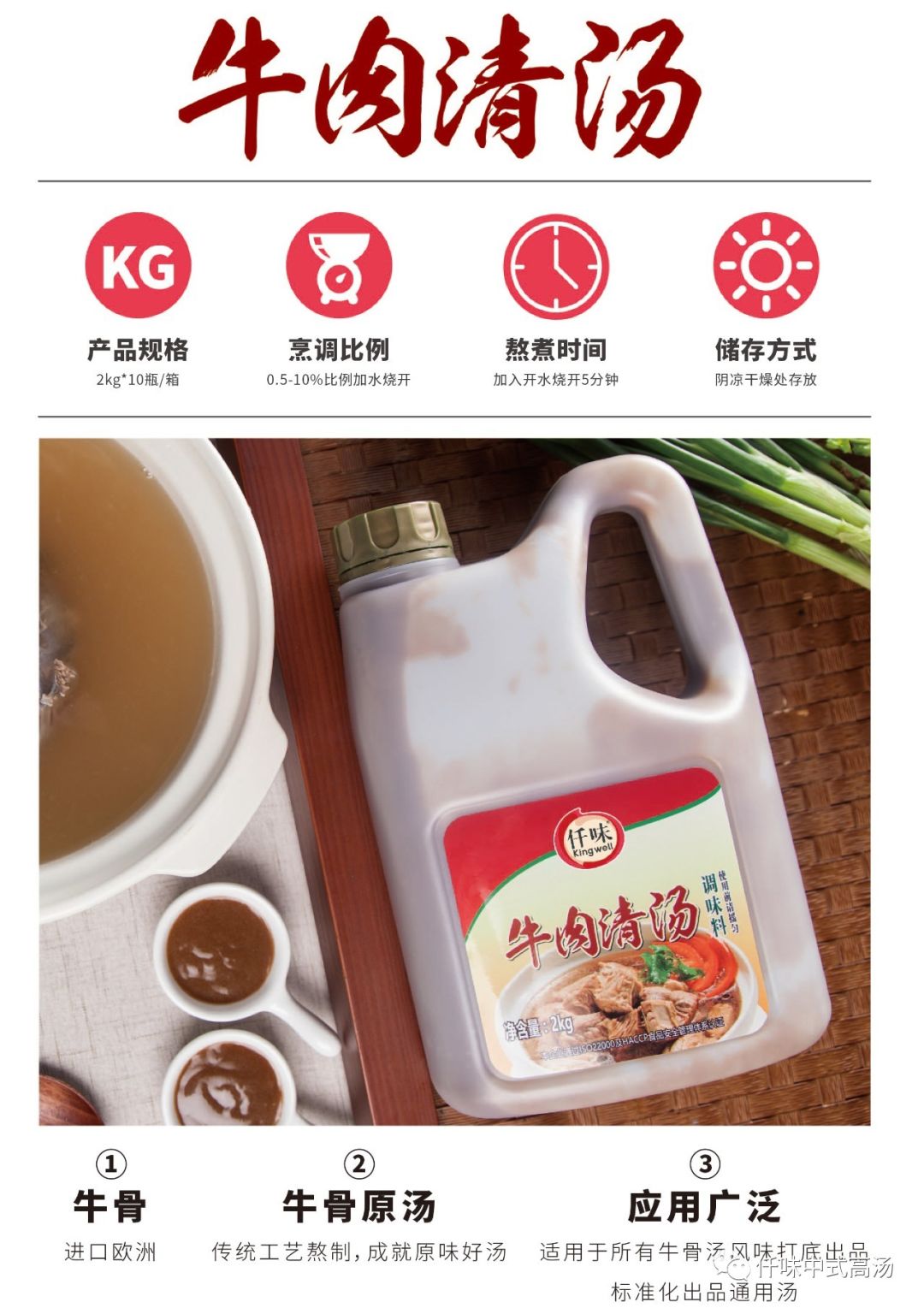 如500g水加入牛肉清汤25-30g煮开即可,适用于牛肉拉面、牛腩面、牛肉粉等出品。
